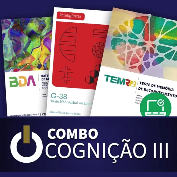 O Combo Cognição III é composto pelo teste de Inteligência G-38, o teste de Memória de Reconhecimento TEM-R-2 e pelo teste de Atenção Alternada, Concentrada e Difusa/Dividida Combo BDA de Aplicação Online.